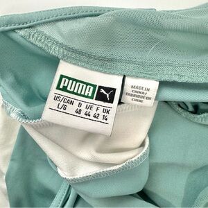 The Puma Archive T7 sleeveless jumpsuit in Sage green with white side stripes is a stylish and versatile one-piece outfit designed for women. This yoga-inspired jumpsuit is adorned with a bold striped pattern, featuring a sleeveless design and side stripes for added flair. The size large offers a comfortable fit, making it perfect for various activities or casual outings. The combination of green color and classic Puma branding ensures a trendy and fashionable look.