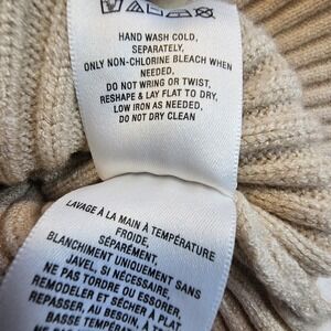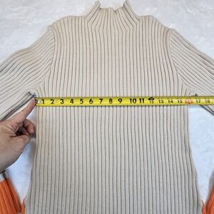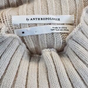 The Anthropologie Mock Neck Tan Orange Sweater is a stylish and warm option for women in size Medium. This sweater features a tight-knit design with a mock neck and long bell sleeves, perfect for adding a touch of elegance to any outfit. Made from a blend of polyester, nylon, and viscose, it is suitable for various occasions such as casual wear, parties, or travel. The beige color and ribbed detailing give this sweater a chic and versatile look, perfect for the winter, fall, or spring seasons. Hand wash only to maintain its quality. No pets or smoke.