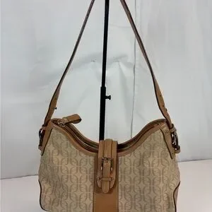 Classic Fossil shoulder bag featuring the signature monogram canvas with genuine leather trim. Timeless early 2000s / Y2K style in a versatile neutral tan and brown colorway—perfect for everyday use.