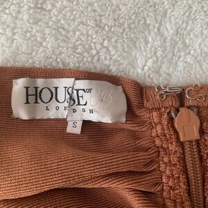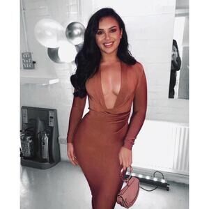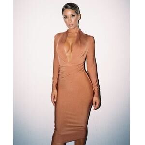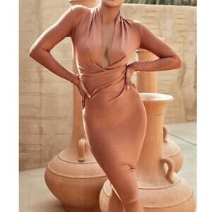HOUSE OF CB Tan Brown Francesca Bandage Draped Cowl Stretch Midi Bodycon Dress