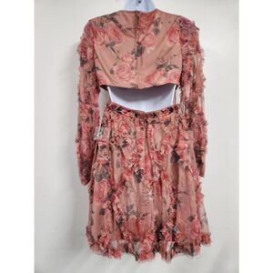 Elegant pink midi dress with floral pattern. Features long sleeves and a flattering cut-out design. Perfect for special occasions.