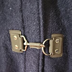 Elegant Calvin Klein wool blend winter coat in a rich navy / deep blue shade, featuring a cozy faux fur trimmed hood and polished buckle/toggle front details. Designed with a flattering tailored silhouette that offers warmth without bulk.