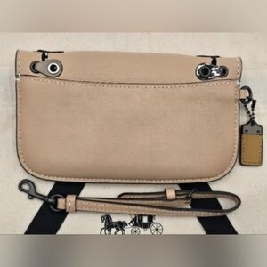 Elegant Coach crossbody bag in tan. Features unique eyelet accents. Ideal for versatile styling.