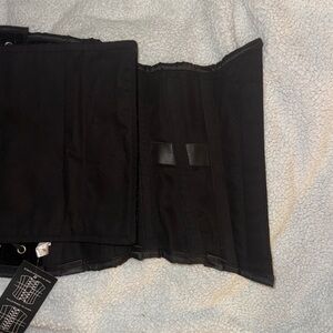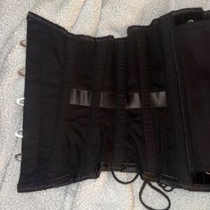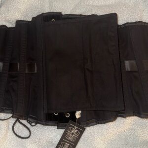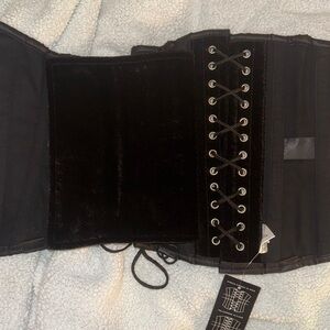 New heavy duty steel boned underbust corset made of soft velvet fabric with a sturdy cotton inner lining. There is a modesty panel in the back. Size 24, so best for 26-28” waists. Purchased in the early 2000s and never worn.
