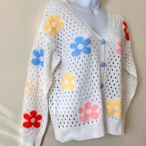 Open Knit Lightweight Cardigan White w Blue Yellow Pink Red Flowers Size Medium