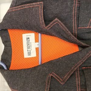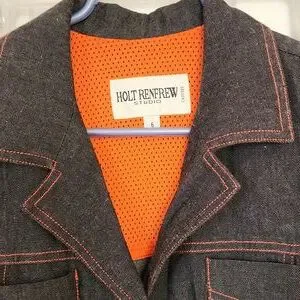 Holt Renfrew Studio Denim Trenchcoat. Orange stitching and accents. Missing belt.