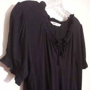 Old Navy black top with ruffle neckline, ties and short puff sleeves. Cute peasant top in women's size medium. No flaws noted.