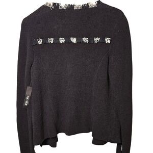 A NIC+ZOE black onyx textured open-front cardigan sweater jacket. This stylish piece features decorative fringe detailing along the edges and collar. Zip pockets on both sides. ⁰The knit fabric offers a comfortable and versatile layering option. New with tags.