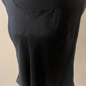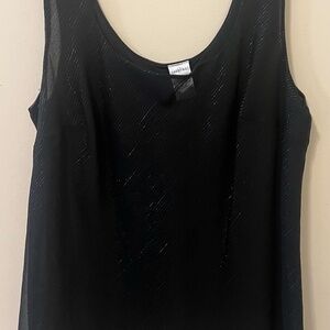 Black sleeveless chiffon blouse with subtle metallic stripe detailing throughout. Lightweight, flowy, semi-sheer overlay with a softly flared hem and elegant drape. Scoop neckline front and back. Perfect for evening wear, dressy occasions, or layered under a blazer or cardigan.
