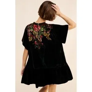 Black velvet mini dress adorned with a vibrant floral embroidery across the yoke and back. This piece features short sleeves, a flattering tiered ruffle hem, and a relaxed silhouette for comfortable wear. Perfect for a night out or a festive gathering.