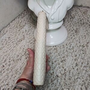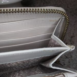 Lightly used, cream leather zip arpund wallet with three dimensional space print, and leather name tag on front from Kate Spade. Wallet has open pocket on back, several inside card pockets and center zip coin pocket. Wallet has a few tiny faint marks on the back, edge near zipper opening and on inside leather near card pockets. Please see all photos.
