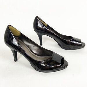 Alex Marie Cashmere Pansy Grey Patent Leather Stiletto Peep Toe Heel Pumps