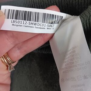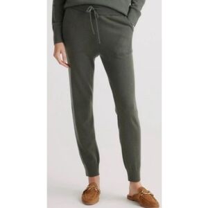 Quince Mongolian Cashmere Joggers featuring a drawstring tie waist, pockets, cuffed ankles, earthy moss green color, high rise, and casual athleisure yet chic sweatpants look. Size small (15" waist, 27" inseam). Perfect for any occasion or just lounging.
