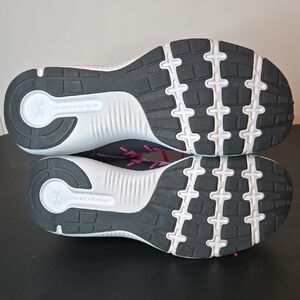 Under Armour sneakers featuring a sleek black design with vibrant pink highlights. Ideal for everyday wear and fitness activities.