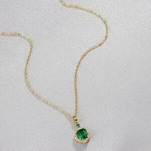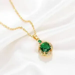 Fashion necklace features a simulated 2 carat regal green Emerald prong set in a gold tone setting with CZ accents hung on an 18 inch gold tone cable chain with a lobster clasp closure.
