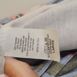 Grey Background with Predominately Pink Floral Print including some greenery and a side knot detail that creates the tank top to drape down towards the knot & be elegant almost.