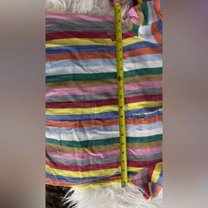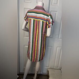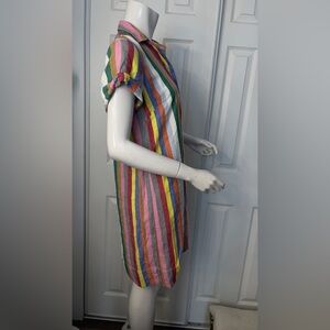 Bright mini dress with multicolor stripes. Features short sleeves and button-up front. Ideal for casual wear.