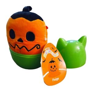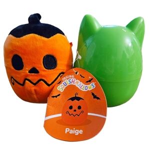 NEW! Squishmallows & Kellytoy 2023 "Paige" the Pumpkin (5") and Green Kitty Container. Brand New. Smoke-Free, Pet-Free Home.