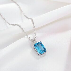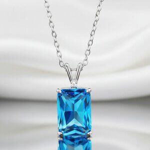 Fashion necklace features a simulated emerald cut 9.72 carat swiss/sea blue Topaz/Sapphire/Aquamarine with a simulated white topaz accent hung on an 18 inch silver tone cable chain with a lobster clasp closure.