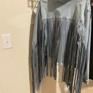 Chic denim jacket with long fringe. Ideal for trendy looks.