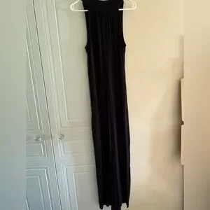 Elegant black sleeveless maxi dress with a deep V-neckline.