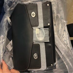 Sleek black leather design. Features silver hardware. Stylish and versatile.