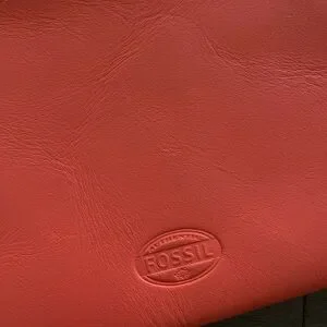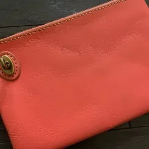 Orange clutch from Fossil. Fair condition. Genuine leather. A few marks on front and back of wallet.