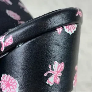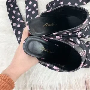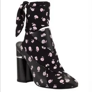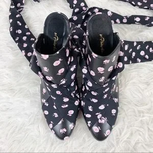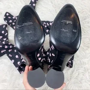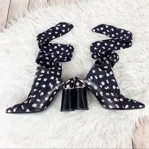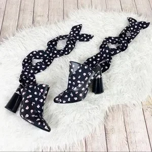 Chic black heels with pink floral pattern. Features wrap-around ankle design. Perfect for stylish occasions.