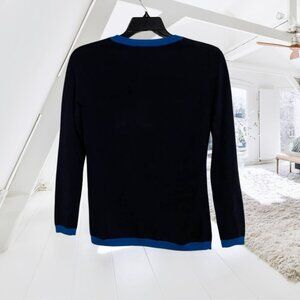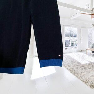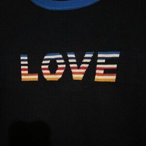 This Tommy Hilfiger sweater is such a fun and feel-good piece and it's new with tags! It’s a navy blue knit pullover with colorful rainbow stripes spelling out “LOVE” across the front. The neckline, cuffs, and hem are accented with a bold pop of blue that makes it stand out even more.