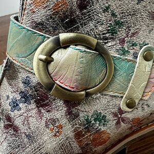 This is a pair of Coralie leather booties in a size 36 by Spring Step L’artiste. They are very artsy and have a floral pattern. Tooled leather. Buckle across front and zipper at side drive them a southwest feel perfect for a cowboy cowgirl aesthetic. These are also perfect for a maximalist. They are a statement piece - art to wear. There is a scuff on the back of the heel and one on the toe (both shown). In my opinion the shoes are so detailed that the toe scuff is really hard to see. Please look at all pictures and decide for yourself.