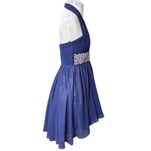 JODI KRISTOPHER ~ Juniors size 3 glittery halter-neck prom dress. Royal blue with a wide rhinestone/gemstone waistband. Backless with an adjustable neck-band and elastic across the back. Fully lined. Some stretch. High-low hem with an underskirt of soft netting. Soft, flowy, sexy. Style #2847-L69C.