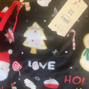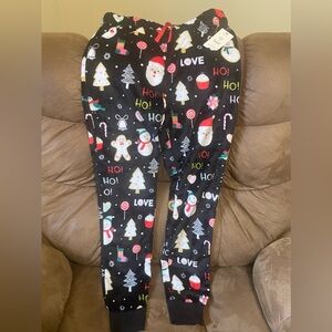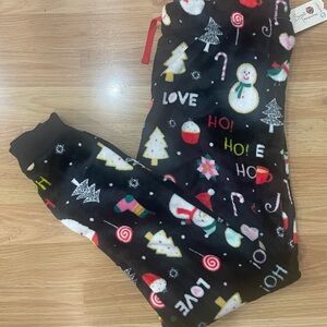 Soft black fleece pajama pants with cheerful winter/holiday motifs. Features snowmen, candy canes, and Christmas trees. I have 4 pair of these if want to bundle.