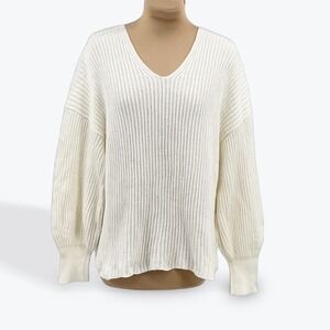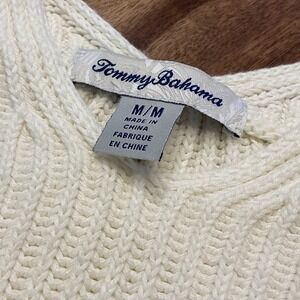 Keywords: Tommy Bahama sweater, cream sweater, v neck sweater, ribbed knit sweater, balloon sleeve sweater, cotton blend sweater, women's sweater, casual sweater, cozy sweater, lightweight sweater, spring sweater, fall sweater, elegant sweater