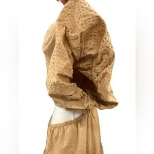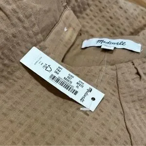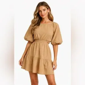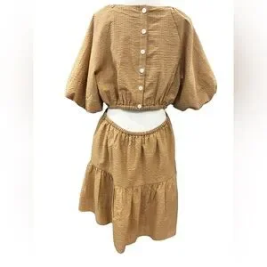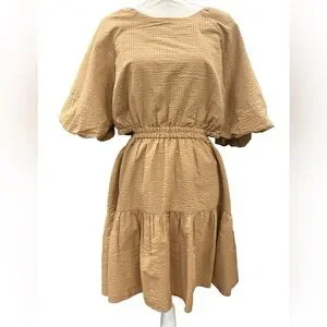 Madewell Seersucker Puff Sleeve Cutout Tiered Mini Dress XL Camel Tan NWT