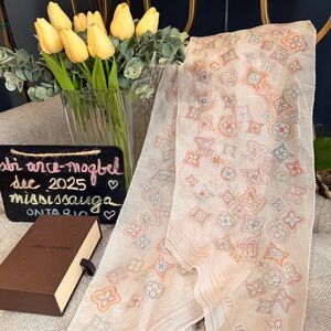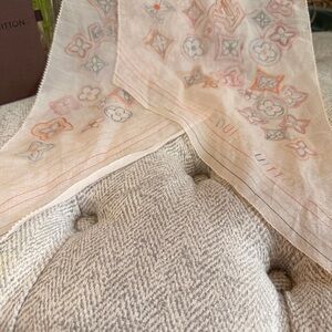 Discover sophistication and luxury with our Louis Vuitton monogram bandeau. Made with a blend of soft cotton and luxurious silk, this bandeau can be worn as a scarf for ultimate comfort. Perfect for any occasion, make a statement with its elegant W: 128 cm x H: 19 cm dimensions. Comes with box for the perfect gift. Features beautiful pastels, dreamy!! In beautiful preloved condition , absolutely authentic.