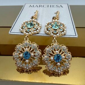 Make a statement with these exquisite Marchesa drop earrings, designed with the brand’s signature romantic elegance. Crafted in a gold-tone setting, these earrings feature two ornate medallion drops adorned with shimmering aqua and blue crystals, delicate faux pearls, and sparkling clear accents. The intricate filigree detailing creates a luxurious, vintage-inspired look that catches the light beautifully.