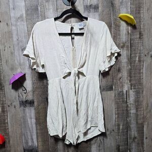 Princess Polly 6 Ragnar Beige Cap Sleeve Deep V-Neck Tie Front Romper Linen Blen