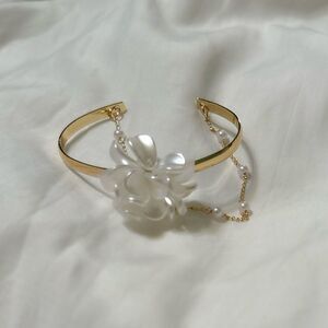 White acrylic flower pearl double layered bangle bracelet in gold tone hardware