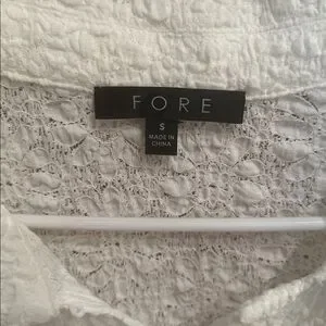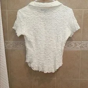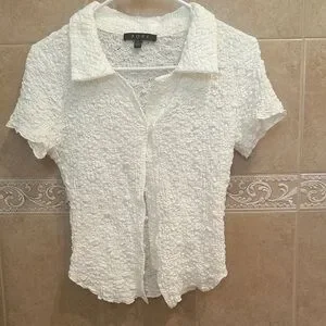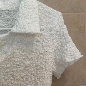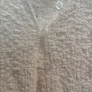 Elevate your wardrobe with this elegant white textured top from . Perfect for any occasion, this stylish piece offers both comfort and sophistication. Adorable flower buttons, has a spare. Brand new condition.