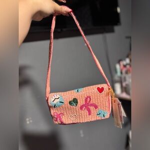 Charming pink shoulder bag with playful embroidery. Features hearts, bows, and more. Perfect for casual outings.