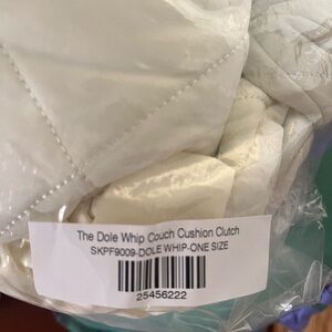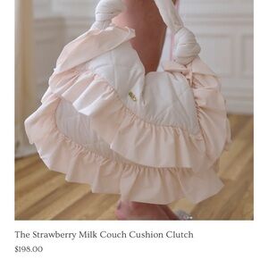 Chic quilted clutch by Selkie. Features elegant ruffle accents. Soft cream color. Perfect for any occasion.