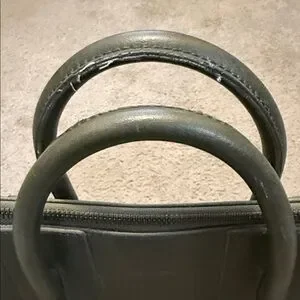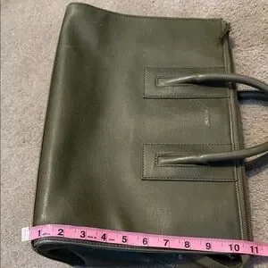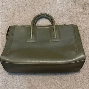 Chic olive green zipper tote by Matt & Nat. Navy blue interior. Durable handles with minimalist style. Vegan and cruelty free leather. Interior made with 100% recycled plastic bottles. Great condition except for a few loose threads on the handle. Clean inside.