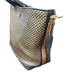 Elevate your style with the Coach Black and Tan Woven Tote Bag. This chic accessory combines elegance and functionality, perfect for any occasion.