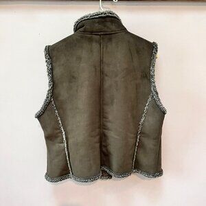 Stylish olive green vest. Features cozy sherpa lining. Button-up front. Perfect for layering.
