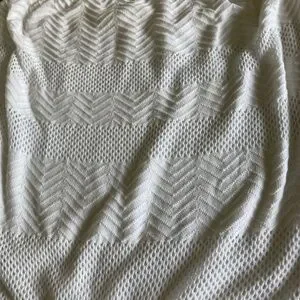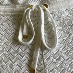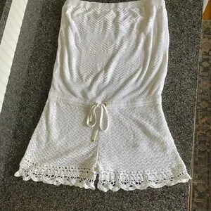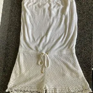 Elegant white strapless romper. Features crochet knit pattern. Perfect for summer outings.