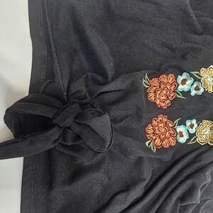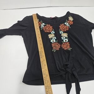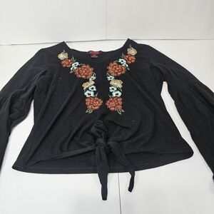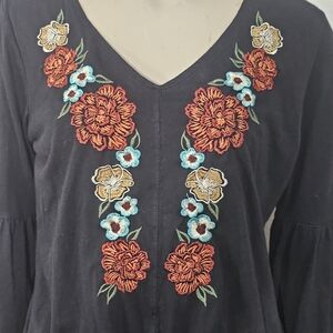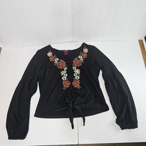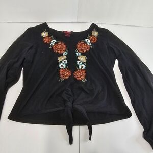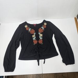 Rock & Roll Denim Chic Black Blouse with Bohemian Embroidered Floral Size M