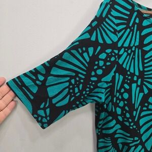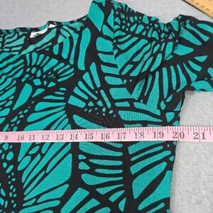 CHICO'S Travelers Top Large Green Black Abstract Crewneck Pullover Stretch Slinky Short Short Sleeve