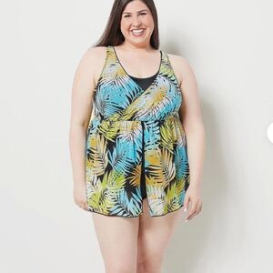 Vibrant swim dress with a tropical leaf print. Features shades of blue, green, and yellow.