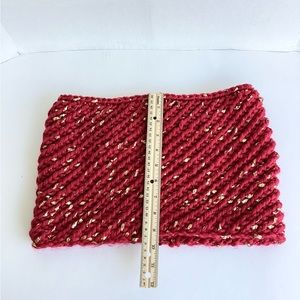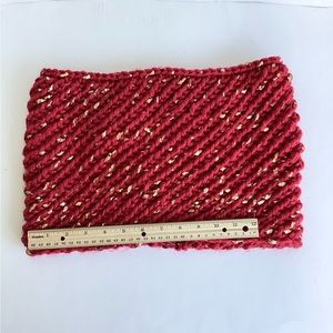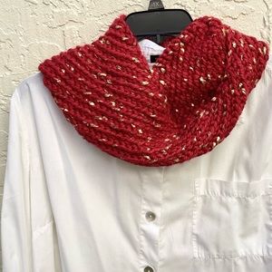Walk the Runway with this beautiful classy hand knit infinity scarf cowl. Bring some color and glitz to your look to brighten a dreary winter with this bright red and gold flecked scarf and keep warm looking good! This chunky scarf can easily be worn for outside to keep your neck, back and shoulders warm or as a statement look indoors. It is wide enough to pull over your head as a hood. It has a very warm soft feel, but the gold flecks bring it up to fashion as well as function. You can wear this scarf for a dressy event or rock it on the streets. It can go everywhere and is a perfect addition to your cold weather accessories.