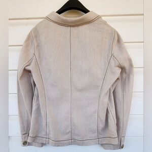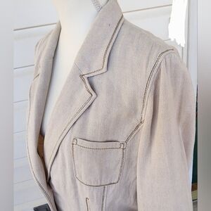 Beautiful Timeless J. Jill Cream Linen/Cotton Blazer/Jacket. Size 14. A sophisticated look with its classic design and neutral color. 55% linen, 45% cotton. Classic herringbone pattern that adds texture and movement to the blazer. Three front open pockets Gorgeous Contrast threading detail. Gently Worn. Minor signs of wear. No stains. No call outs. Perfect in so many settings, dress up or down, breathable, quality fabric. Wardrobe Staple. Measures 22" armpit to armpit, 25" length, 17" shoulder to shoulder, 25" sleeves. Check out more cool stuff in this closet!